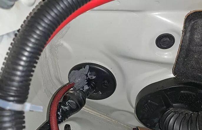 This is where the sound system power cord passes through the firewall and enters the car, with sealant applied.