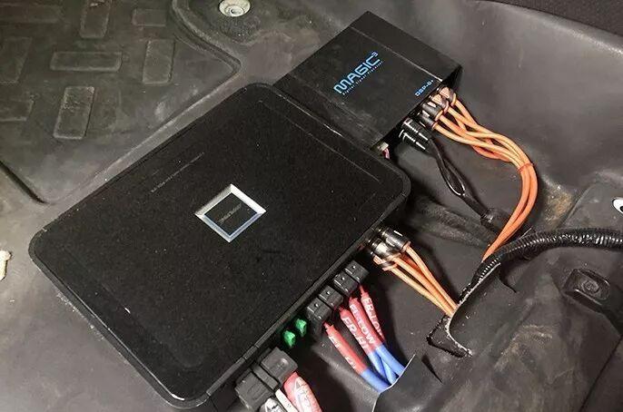Alpine four-channel power amplifier and Magic Cube dsp are installed under the passenger seat.