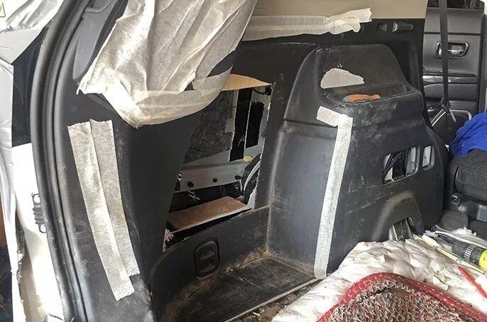 The location of the box modification is on the left side of the trunk. Due to the demand of box volume, a small piece of decorative panel has to be cut off, and the cut decorative panel is placed in the car, so that customers can reset and install it in the future and replenish it to its original shape.